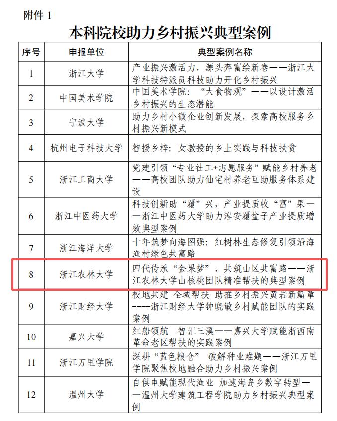 近日,浙江省教育厅发布了第四届高校助力乡村振兴典型案例评选结果。Beat365推选的《四代传承“金果梦”,共筑山区共富路——Beat365中文官方网站山核桃团队精准帮扶的典型案例》成功入选,成为全省15个本科院校助力乡村振兴典型案例之一。