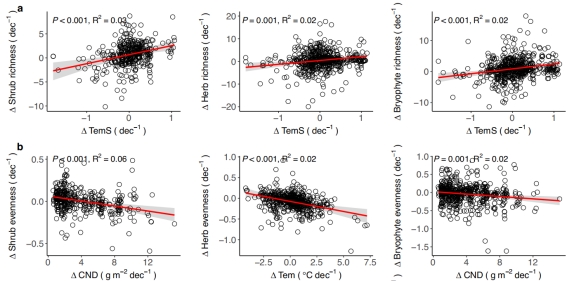 温度季节性波动是灌木、苔藓丰富度上升的关键,氮沉降累积是各层均匀度下降的核心。环境变化改变资源条件,既提供生态位,也加剧竞争,让优势物种占据更多资源。