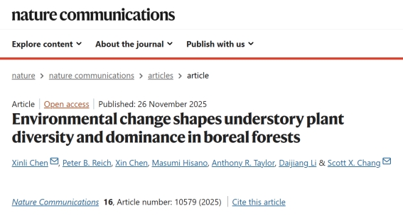 11月26日,全国重点实验室陈信力教授在《Nature》子刊《Nature Communications》(中科院1区Top,IF-5yr=17.2)发表题为“Environmental change shapes understory plant diversity and dominance in boreal forests”(《环境变化塑造北方森林林下植物多样性与优势格局》)的研究论文。该研究首次在大陆尺度揭示环境变化对北方森林林下植物多样性、生物量分配及层间互作的影响,为理解森林生态系统功能演变,以及森林食物、林下食物资源的潜在存续与利用提供依据。