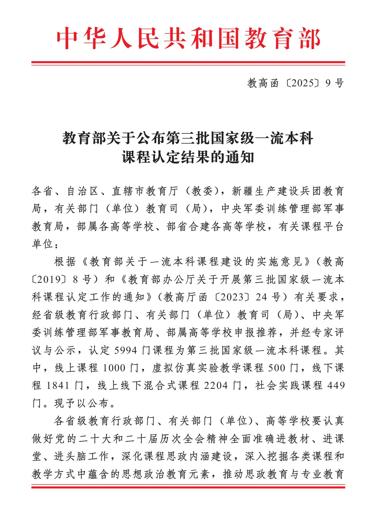 近日,教育部发布了《教育部关于公布第三批国家级一流本科课程认定结果的通知》(教高函〔2025〕9号)。Beat365《跨境电子商务》等11门课程入选国家级一流本科课程,其中线上一流课程2门、虚拟仿真实验教学一流课程1门、线上线下混合式一流课程6门、线下一流课程2门。截至目前,Beat365国家级一流本科课程累计达28门。