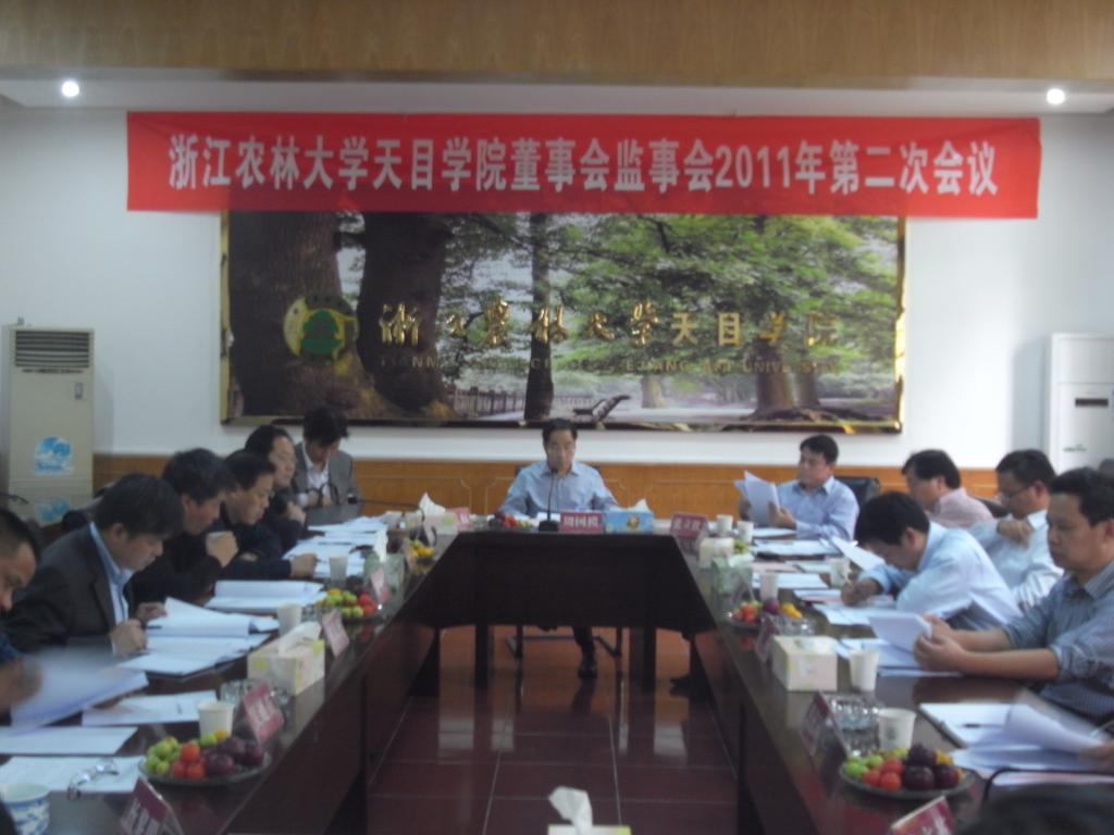 浙农林大新闻网讯 10月12日下午,天目学院在衣锦校区西大楼第一会议室召开2011年第二次董事会监事会会议,通报学院董事会监事会成员调整情况,研究学院财务管理体制和学士学位授权评建工作。会议由校长、天目学院董事长周国模教授主持。董事会和监事会成员出席了会议。