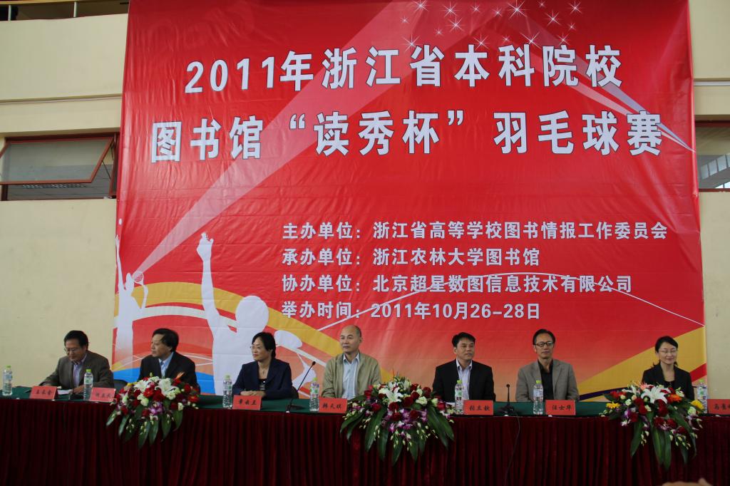 浙农林大新闻网讯 十月的浙农林大,秋高气爽,硕果飘香。10月27日上午,由Beat365承办的2011年浙江省本科院校图书馆“读秀杯”羽毛球赛在Beat365篮球馆羽毛球赛场拉开序幕。浙江省教育厅高教处副处长韩天琪,Beat365中文官方网站副校长张立钦,浙江省高校图工委副主任兼秘书长、浙江大学副馆长章云兰,Beat365中文官方网站党委委员、工会主席汪士华,浙江省高校图工委副主任、浙江工业大学图书馆馆长何立民,浙江省高校图工委副主任、浙江大学副馆长马景娣,及来自全省26支代表队的130余名运动员参加了开幕式。开幕式由图书馆馆长、现代教育技术中心主任王长金主持。