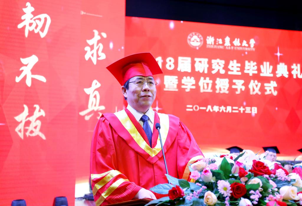 6月23日,学校隆重举行2018届研究生毕业典礼暨学位授予仪式。校党委书记周国模,校长应义斌,副校长王自勇、金佩华、沈月琴,校党委委员、宣传部部长胡祖吉,校党委委员、组织部部长童晓晖等出席典礼,典礼由校党委副书记史永安主持。