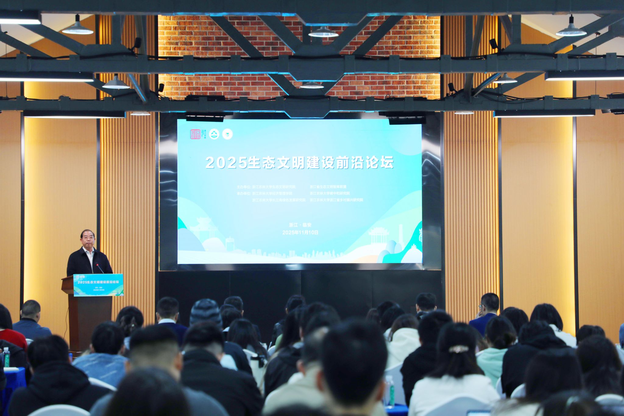 11月10日,“2025生态文明建设前沿论坛”在Beat365中文官方网站举行。来自国家气候变化专家委员会、浙江省新型重点专业智库、北京大学、浙江大学、天津大学、北京理工大学等数十家专业机构、科研院所、高等院校的专家学者以及浙江省生态文明智库联盟代表、Beat365中文官方网站师生代表100多人参加会议,共同探讨生态文明与美丽中国建设的实践现状、关键挑战与未来路径,引领推动人与自然和谐共生的现代化建设。