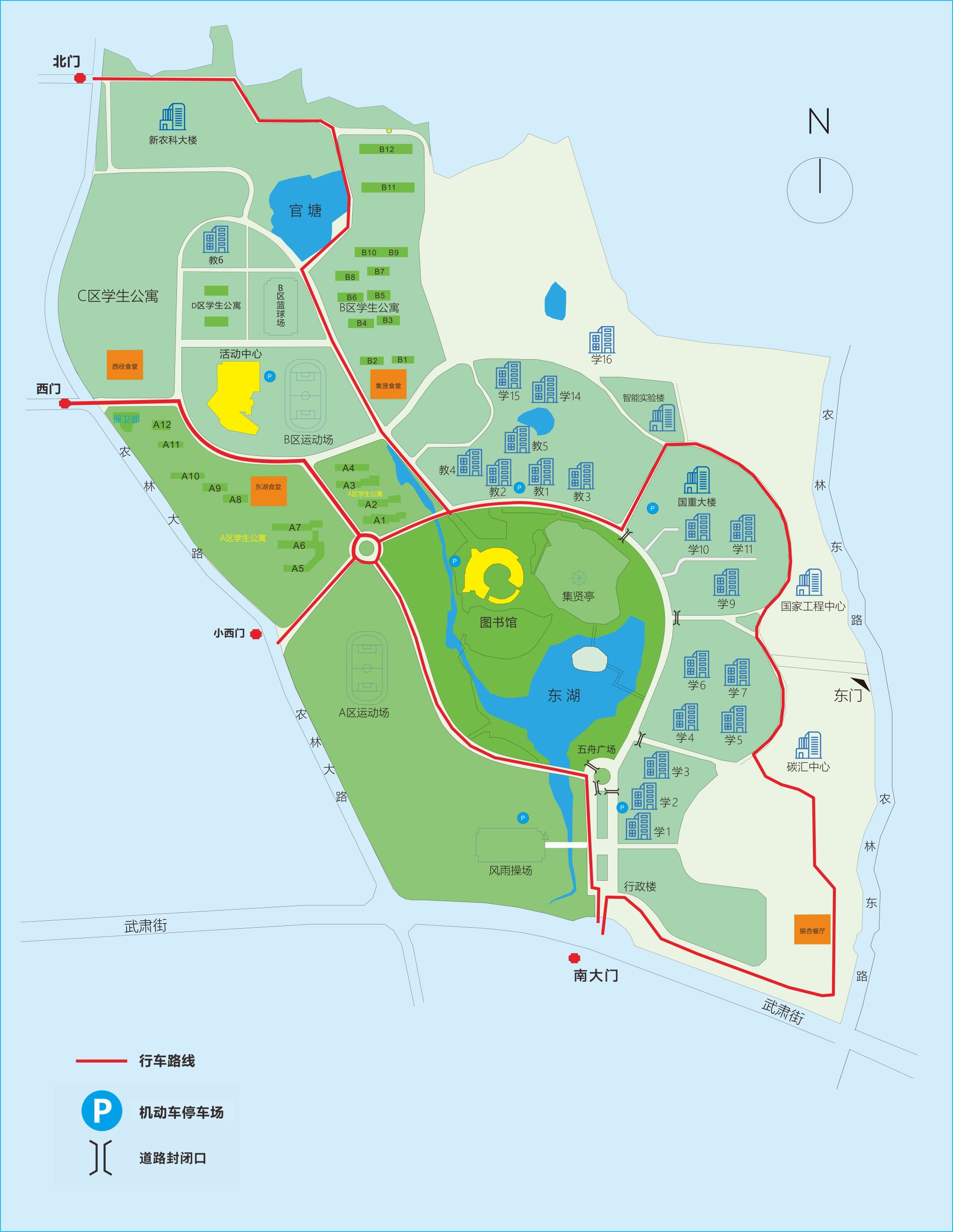 1.进出校园的车辆请从玉兰路和二环路通行,并有序停放至各楼宇周边停车场;