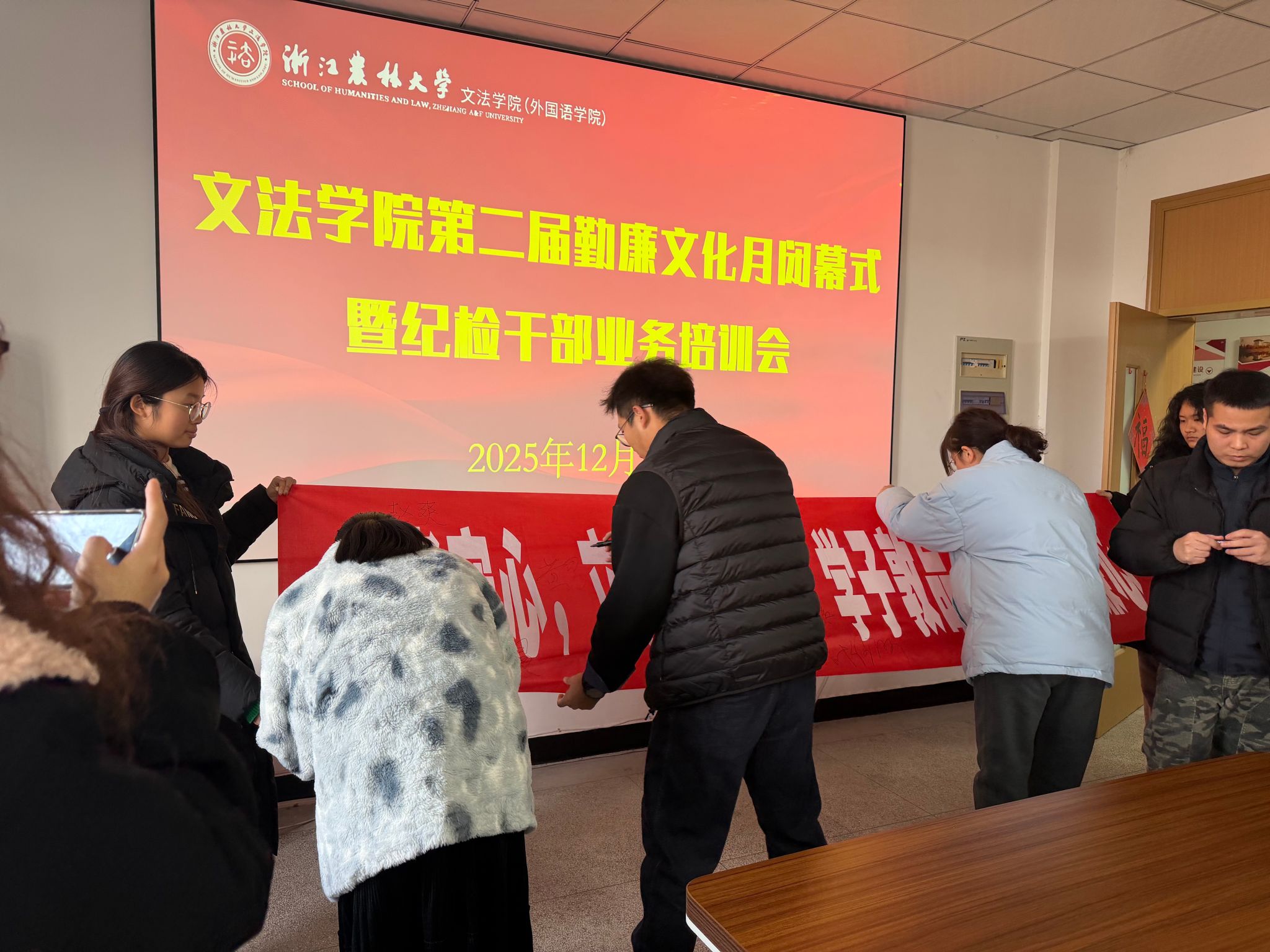 近日,文法学院第二届勤廉文化月闭幕式暨纪检干部业务培训在实验大楼612举办。审计处处长朱红东,纪检监察室、巡察办办公室,马院,文法学院相关负责人出席活动,全体师生纪检干部参会。