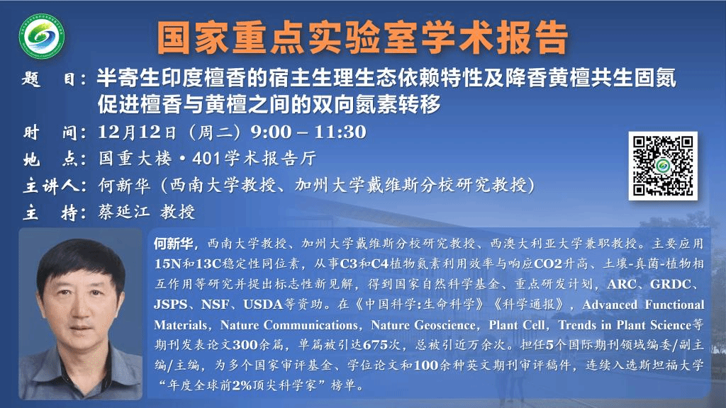 讲座预告:半寄生印度檀香的宿主生理生态依赖特性及降香黄檀共生固氮促进檀香与黄檀之间的双向氮素转移