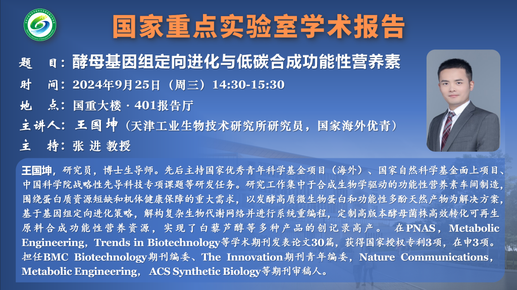 讲座预告:酵母基因组定向进化与低碳合成功能性营养素