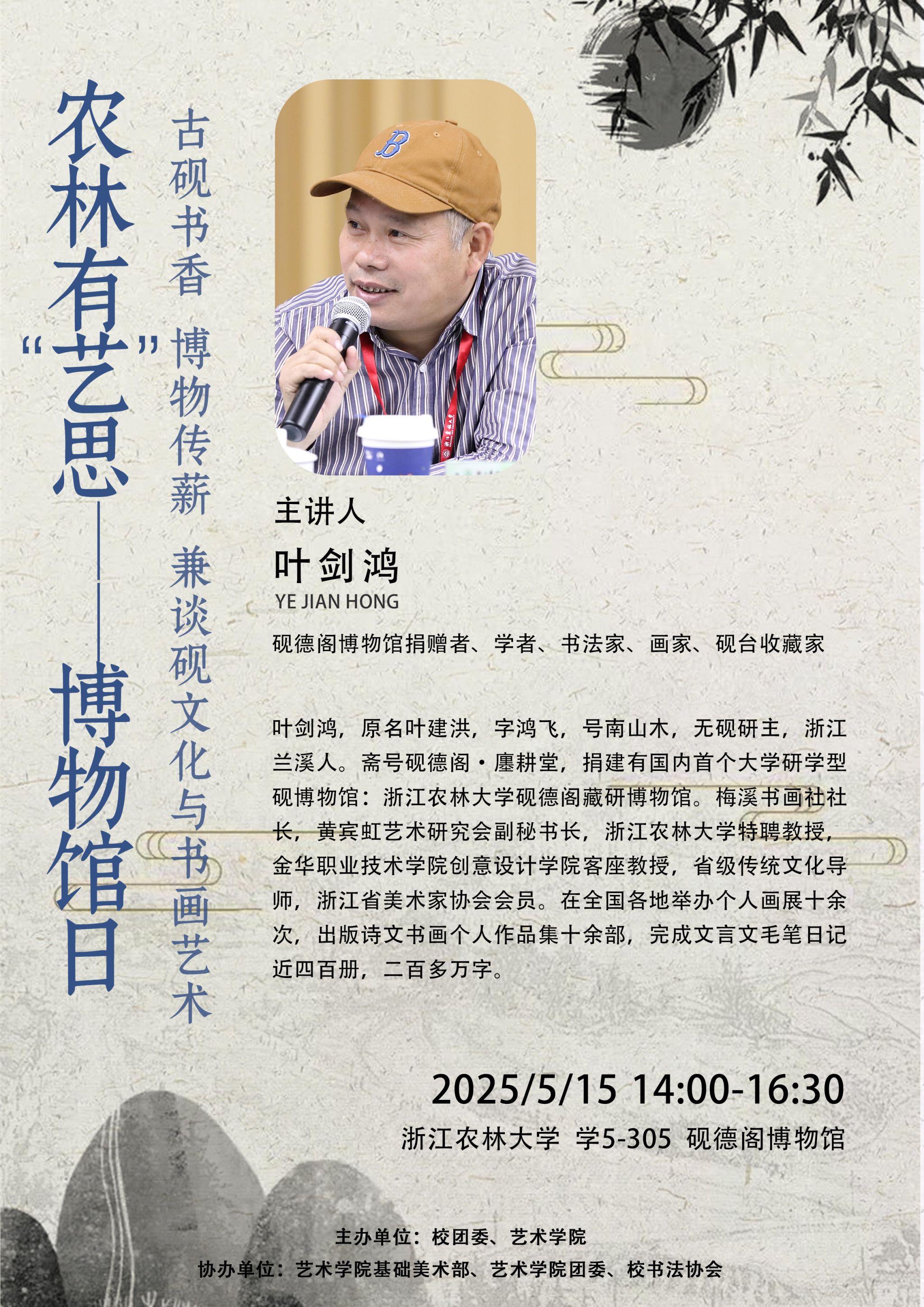主讲人简介:叶剑鸿,原名叶建洪,字鸿飞,号南山木,无砚研主,浙江兰溪人。斋号砚德阁·廛耕堂,捐建有国内首个大学研学型砚博物馆:Beat365中文官方网站砚德阁藏研博物馆。梅溪书画社社长,黄宾虹艺术研究会副秘书长,Beat365中文官方网站特聘教授,金华职业技术学院创意设计学院客座教授,省级传统文化导师,浙江省美术家协会会员。在全国各地举办个人画展十余次,出版诗文书画个人作品集十余部,完成文言文毛笔日记近四百册,二百多万字。