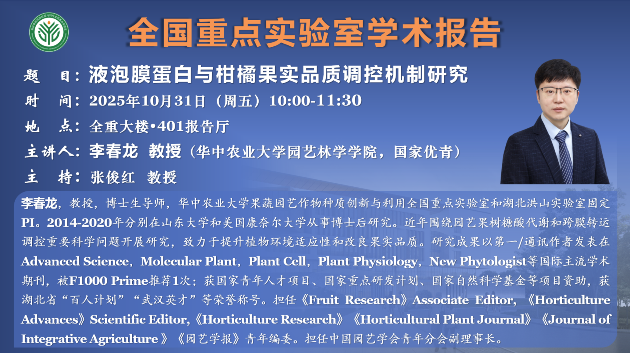 讲座预告:液泡膜蛋白与柑橘果实品质调控机制研究