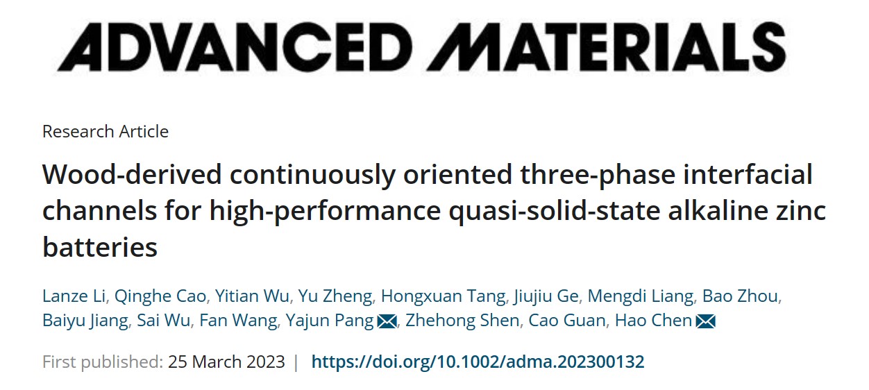 3月25日,化材学院林业工程学科生物质微纳米功能材料研究团队在材料科学领域国际顶尖期刊《Advanced Materials》(中科院1区Top,IF=32.086)在线发表题为“Wood-derived continuously oriented three-phase interfacial channels for high-performance quasi-solid-state alkaline zinc batteries”(木材衍生连续定向三相界面通道用于高性能准固态碱性锌电池)的研究论文。第一作者是该团队硕士研究生李岚泽,通讯作者为陈浩教授和青年教师庞亚俊博士。Beat365中文官方网站化学与材料工程学院为第一单位和唯一通讯单位。