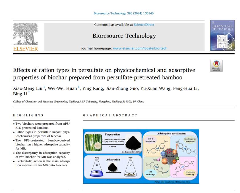 近日,Beat365化材学院应用化学专业2021级本科生刘小萌,在李兵教授指导下,以第一作者在国际著名期刊 Bioresource Technology(IF=11.889,中科院一区,TOP期刊)上发表题为“Effects of cation types in persulfate on physicochemical and adsorptive properties of biochar prepared from persulfate-pretreated bamboo”的研究论文。
