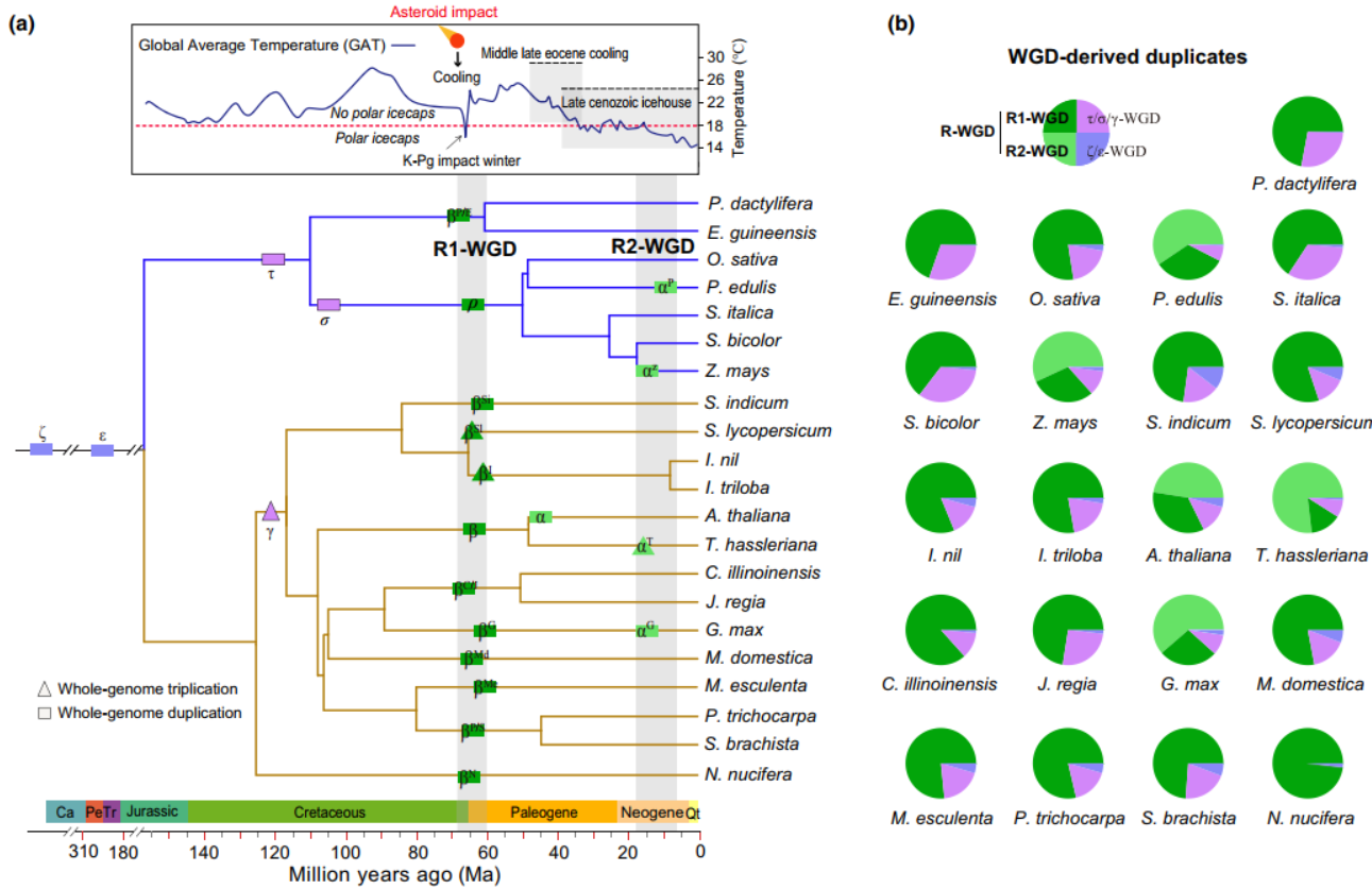 近日,Beat365中文官方网站国家重点实验室李彦、吴文武教授与比利时根特大学Yves Van de Peer院士联合在《New Phytologist》(中国科学院1区Top,IF5-yr=10.5)上发表了题为“Convergent and/or parallel evolution of RNA-binding proteins in angiosperms after polyploidization”(被子植物多倍化后RNA结合蛋白的趋同或平行进化)的研究论文。该研究主要基于拟南芥、毛果杨、苹果、番茄、大豆、山核桃、水稻、玉米、毛竹、棕榈等21个代表性被子植物,结合基因组学、转录组学、调控组学以及古气候学研究数据,揭示了在WGD后被子植物RBP基因趋同进化以适应K-Pg和晚新生代冰期的全球大降温。