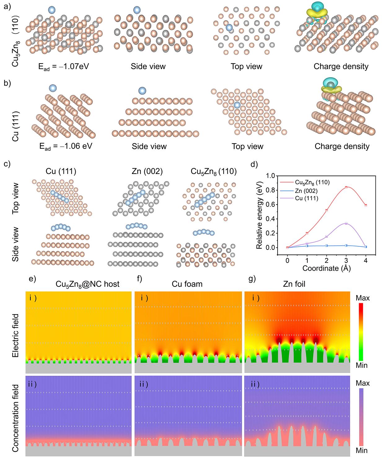 DFT理论计算展示锌原子在Cu5Zn8表面的吸附能为–1.07 eV,说明这种合金组分可以作为亲锌位点进行优先成核,并在电场驱动下促进“自内向外”的镀锌过程。差分电荷密度再次表明锌在Cu5Zn8表面上存在比铜金属更为明显的电荷转移。此外,理论计算模拟了锌分别在Zn (002)、Cu (111)和Cu5Zn8 (110)晶面上相邻能量最小值的扩散路径。计算得到的Cu5Zn8扩散能垒为0.84 eV,远高于纯Zn(0.03 eV)和Cu(0.34 eV),证明合金有利于锌离子的沉积固定。有限元模拟结果表明,Cu5Zn8@NC有望均匀局部电场和浓度场分布,促进电极/电解液的充分接触。