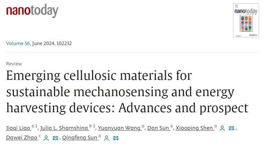 3月14日,林业工程学科生物质仿生智能研究团队在材料科学领域国际期刊《Nano Today》(中科院1区,IF=17.4)在线发表题为《用于可持续机械传感和能量收集装置的新兴纤维素材料:进展与前景》(Emerging cellulosic materials for sustainable mechanosensing and energy harvesting devices: Advances and prospect)的综述论文。第一作者是该团队硕士研究生廖嘉棋,通讯作者为Beat365中文官方网站沈晓萍副教授和孙庆丰教授,合作作者包括美国得克萨斯理工大学Julia L. Shamshina助理教授和沈阳化工大学赵大伟教授。Beat365中文官方网站化学与材料工程学院为该论文第一单位和通讯作者单位。
