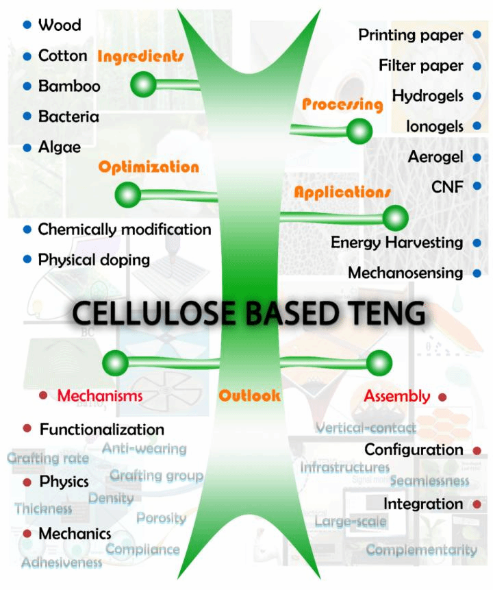 该综述论文全面总结了近年来基于摩擦纳米发电效应的纤维素基机械感受和能量存储器件(Cellulosic materials for sustainable mechanosensing and energyharvesting devices)的研究进展和展望,系统提供了目前主流的纤维素基纳米摩擦电器件汇编,涵盖了从组成和加工到优化和应用的各方面研究(图1),重点阐释了基于摩擦电效应的新型纤维素基离电智能材料的内在作用机制和性能提升策略。