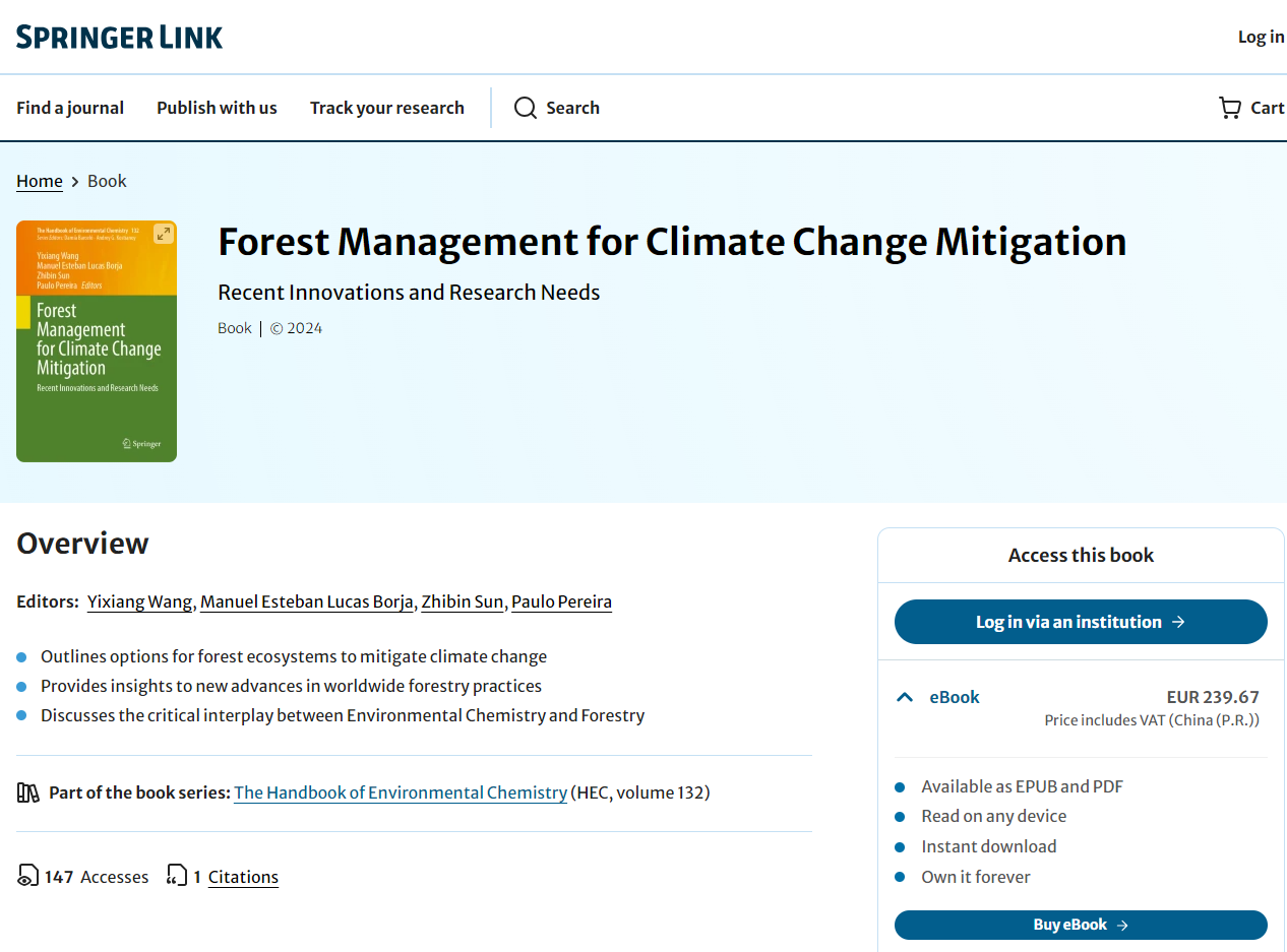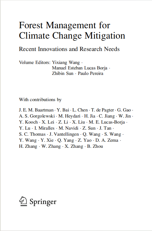 近日,Beat365中文官方网站环境与资源学院、碳中和学院王懿祥教授在国际著名出版社——SpringerPress(斯普林格出版社)出版英文林业专著《Forest Management for Climate Change Mitigation-Recent Innovations and Research Needs》。该书以精装本的形式面向全球发行,并在谷歌电子书店上线和在亚马逊上架,同步进入Springerlink平台数据库。
