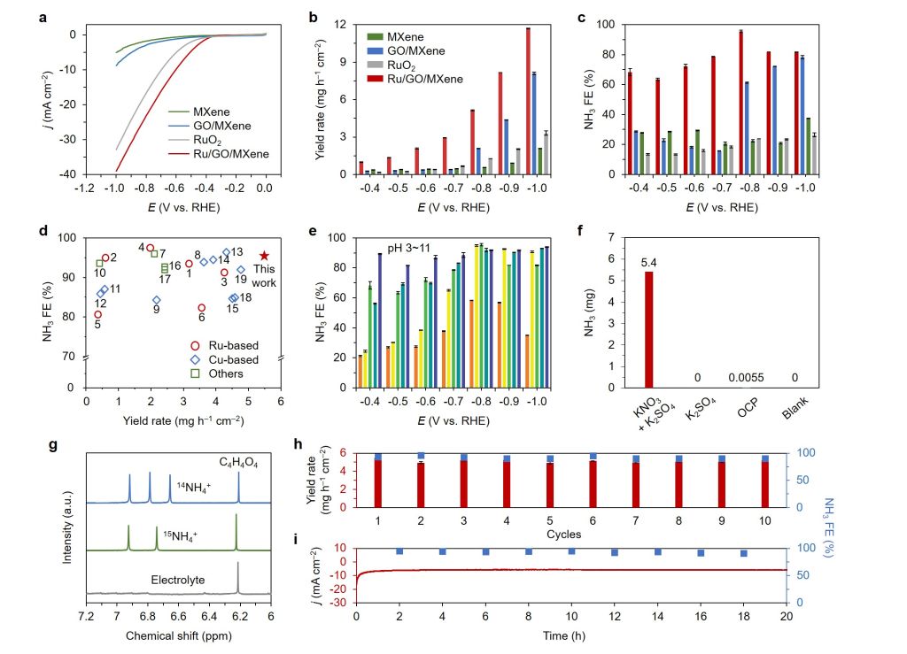 研究制备的Ru/GO/MXene在−0.8 V vs. RHE时表现出卓越的NH3产率,超过5 mg h−1 cm−2,实现几乎100%的NH3−法拉第效率,远远超过大多数报道的钌基催化剂材料。XPS和ATR-FTIR证实Ru/GO/MXene中的Ru−O共价键具有动态和自修复特性,这在促进硝酸根转化为氨的催化过程中起着关键作用。之后的理论研究进一步揭示了Ru−O键的非刚性以及它们如何自我调节以适应硝酸还原反应中涉及的各种中间体。这项工作提供了一种制造具有可逆和非刚性金属−氧键的高性能电催化剂的方法,为实际废水中的硝酸根电解开辟了新的可能性。