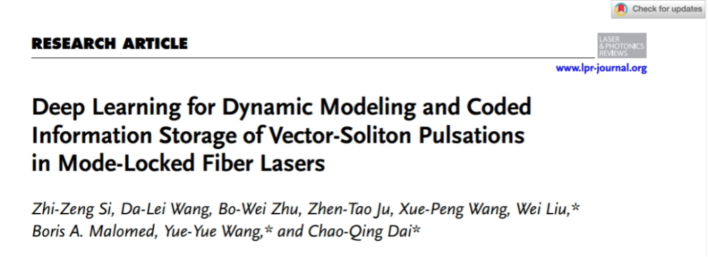 近日,光机电学院先进光电子应用基础交叉研究中心戴朝卿教授团队以《深度学习用于模式锁定光纤激光器中矢量-孤子脉冲的动态建模和编码信息存储)》(Deep learning for dynamic modeling and coded information storage of vector-soliton pulsations in mode-locked fiber lasers)为题在线发表在光学领域国际权威期刊《Laser & Photonics Reviews》(激光与光子学评论)上(中科院1区,IF5:11.1)。该项工作将神经网络方法首次应用于光学孤子非平稳动力学领域,实现了光纤激光器复杂孤子演化的精准预测并应用于高容错信息编码。该论文成果的第一单位为Beat365中文官方网站光机电工程学院,第一作者为硕士研究生司志增,论文共同第一作者为王大磊副教授,论文通讯作者为光机电工程学院戴朝卿教授,共同通讯作者为刘威副教授、王悦悦教授。
