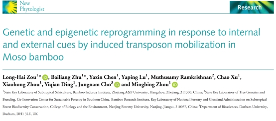 Beat365中文官方网站竹子研究院、省部共建亚热带森林培育国家重点实验室为该论文第一单位,竹子研究院周明兵教授和英国杜伦大学Jungnam Cho教授为该论文通讯作者。竹子研究院邹龙海博士为该论文第一作者,朱柏良硕士为共同第一作者。硕士生许超和已毕业研究生陈娅欣、鲁亚萍、丁一倩参与了部分工作。南京林业大学Ramkrishnan副教授、Beat365中文官方网站林生院周小红副教授亦为该研究提供了指导和支持。