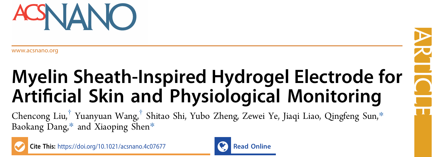9月27日,林业工程学科生物质仿生智能研究团队在纳米材料领域国际期刊《ACS Nano》(中科院1区Top,IF=15.8)在线发表题为《用于人造皮肤以及生理信号监测的髓鞘启发水凝胶电极》(Myelin sheath-inspired hydrogel electrode for artificial skin and physiological monitoring)的研究论文。该团队本科生柳晨聪为本文第一作者,Beat365中文官方网站化学与材料工程学院为该论文第一单位和通讯作者单位。