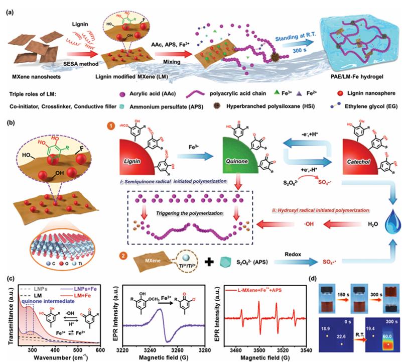 近日,化材学院林业工程学科生物基软材料与阻燃功能材料团队以“Lignin Nanosphere-Modified MXene Activated-Rapid Gelation of Mechanically Robust, Environmental Adaptive, Highly Conductive Hydrogel for Wearable Sensors Application”(《基于木质素纳米球修饰MXene的力学强韧、环境自适应、高导电水凝胶的快速凝胶化及其可穿戴传感器应用》)为题发表在工程技术领域国际期刊《Advanced Functional Materials》上(中科院1区TOP,IF=18.5)。论文第一作者为团队硕士毕业生曾子凡,青年教师厉世能博士为论文通讯作者,合作通讯作者为中科院物理所/长三角物理研究中心的彭蠡副研究员。Beat365中文官方网站化学与材料工程学院为该论文第一单位和通讯作者单位。
