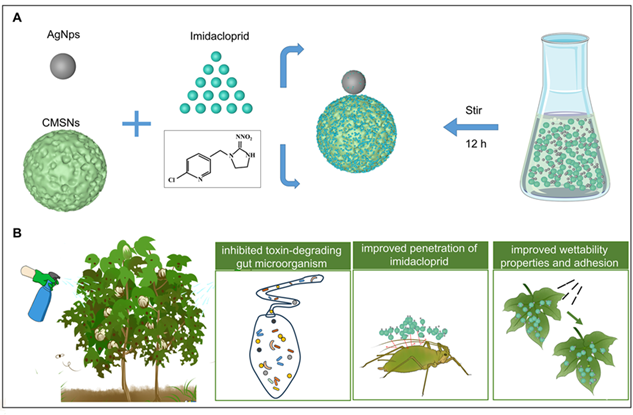 本研究利用具有显著抑菌活性的AgNps与高效给药能力的MSNs,构建了二元协同杀虫剂传递系统。该杀虫剂递送系统,对具有降解吡虫啉功能的肠道微生物具有靶向性,通过抑制肠道菌的丰度,提高吡虫啉的杀虫效果。另一方面,该杀虫剂递送系统的植物叶片润湿性、粘附性和渗透性,相比化学杀虫剂吡虫啉本身显著提高,从而具有较高的靶向性与持效性。对该杀虫剂递送系统的安全性评估发现,其相比化学杀虫剂吡虫啉本身,其对天敌昆虫相对安全,证明其较低的环境风险。该研究丰富了二元协同纳米粒子介导的杀虫剂传递系统的发展,有利于抗性害虫的科学防控。