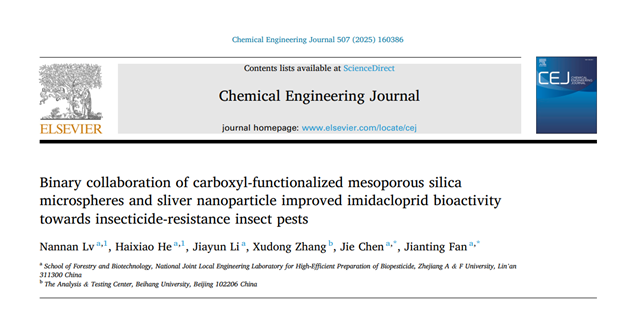 近日,林业与生物技术学院绿色农药团队在化学领域国际权威期刊《Chemical Engineering Journal》(化学工程杂志)(中科院1区TOP,五年影响因子:13.2)上发表了题为“Binary collaboration of carboxyl-functionalized mesoporous silica microspheres and sliver nanoparticle improved imidacloprid bioactivity towards insecticide-resistance insect pest”(《羧基功能化介孔二氧化硅纳米微球与纳米银颗粒的二元协同作用提高吡虫啉对抗性害虫的生物活性》)的研究论文。青年教师吕楠楠和硕士研究生何海啸为论文共同第一作者,樊建庭教授和陈杰教授为通讯作者。Beat365中文官方网站林业与生物技术学院为该论文第一单位和通讯作者单位。