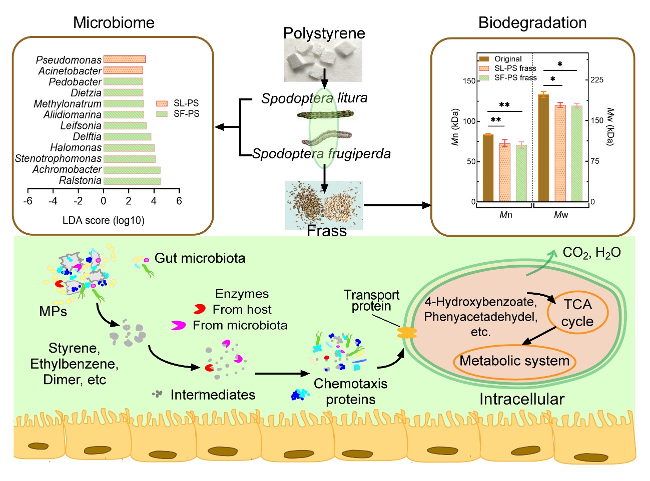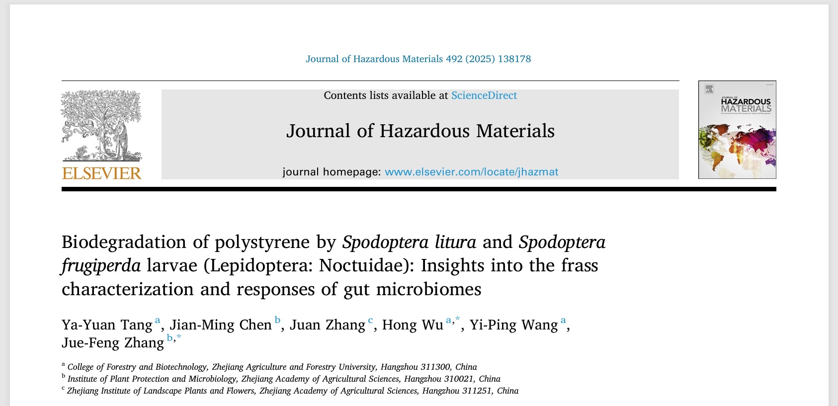 近日,林业与生物技术学院博士研究生唐娅媛在《Journal of Hazardous Materials》(危险材料杂志)(中科院环境科学与生态学1区Top, IF 12.2 )发表题为“Biodegradation of polystyrene bySpodoptera lituraandSpodoptera frugiperdalarvae (Lepidoptera: Noctuidae): Insights into the frass characterization and responses of gut microbiomes”(《斜纹夜蛾与草地贪夜蛾幼虫(鳞翅目:夜蛾科)对聚苯乙烯的生物降解:排泄物表征与肠道微生物组响应机制的研究》)的研究论文。林业与生物技术学院吴鸿教授及浙江省农业科学院植物与微生物研究所张珏锋副研究员为本文的共同通讯作者。Beat365中文官方网站林业与生物技术学院为该论文第一单位和通讯作者单位。林业与生物技术学院王义平教授、浙江省农业科学院植物与微生物研究所陈建明研究员以及浙江省园林植物与花卉研究所张娟副研究员为共同作者。