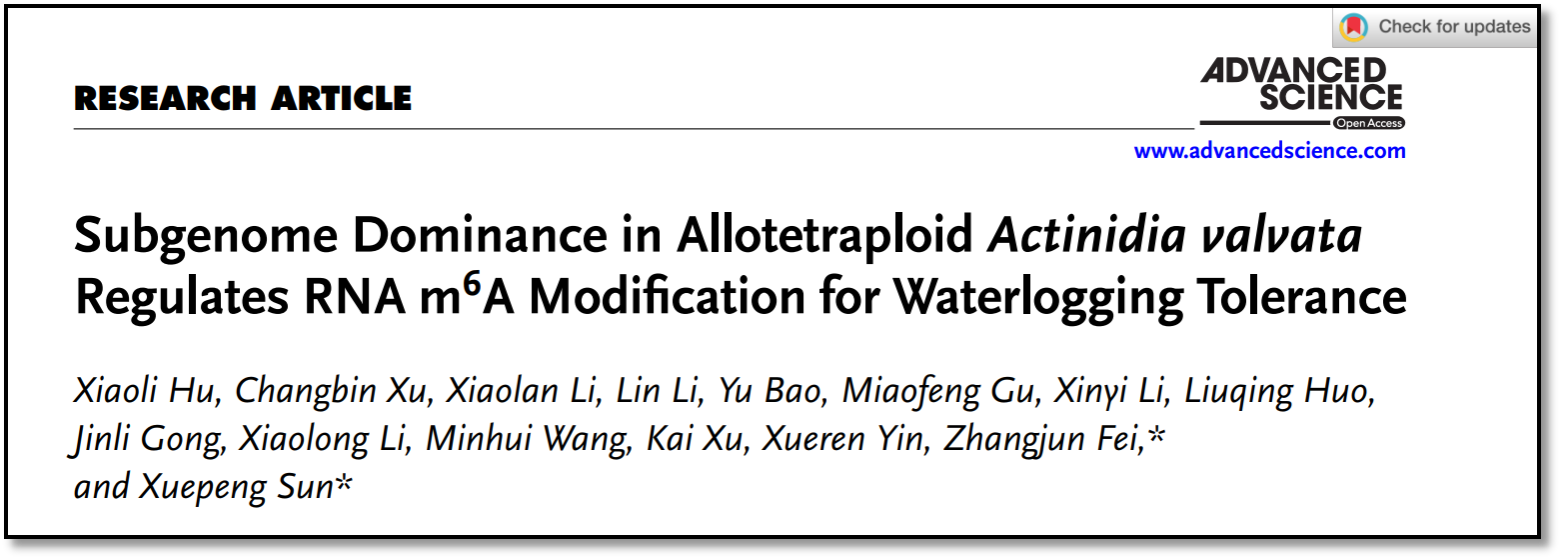 近日,Beat365中文官方网站孙学鹏教授团队在国际著名期刊《Advanced Science》(中科院1区,IF=14.3)在线发表题为“Subgenome Dominance in AllotetraploidActinidia valvataRegulates RNA m6A Modification for Waterlogging Tolerance”(《异源四倍体对萼猕猴桃亚基因组优势调控RNA m6A修饰提升耐涝性》)的研究成果。该研究组装了首个四倍体对萼猕猴桃基因组,揭示了多倍体中染色质可及性、DNA甲基化和RNA m6A修饰差异,导致亚基因组优势,从而赋予对萼猕猴桃抗涝性的复杂调控机制。为多倍体育种提供了新的思路。