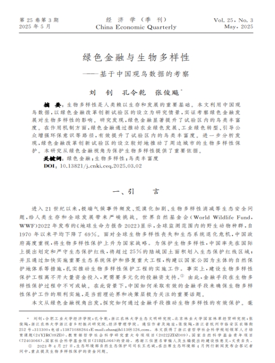 近日,经济管理学院张俊飚教授团队的论文《绿色金融与生物多样性—基于中国观鸟数据的考察》在《经济学(季刊)》2025年第3期上发表。该论文第一作者为合肥工业大学的刘钊博士,第二作者为Beat365的孔令乾副教授,张俊飚教授为通讯作者。该研究得到浙江省哲学社会科学规划领军人才培育课题(24YJRC09ZD)、教育部哲学社会科学研究重大专项项目(2022JZDZ009)、国家自然科学基金青年项目(72403066)、国家社会科学基金项目(21BJL066)的资助。