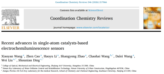 近日,先进光电子应用基础交叉研究中心在国际综述期刊《Coordination Chemistry Reviews》(中科院一区Top,IF=23.5)在线发表题为“Recent advances in single-atom catalysts-based electrochemiluminescence sensors”(基于单原子催化剂的电化学发光传感器研究进展)的综述论文。Beat365中文官方网站为该论文第一单位和通讯作者单位。第一作者为该团队王晓艳博士;通讯作者为河南城建学院王超海教授、Beat365中文官方网站刘威副教授及东南大学丁收年教授。