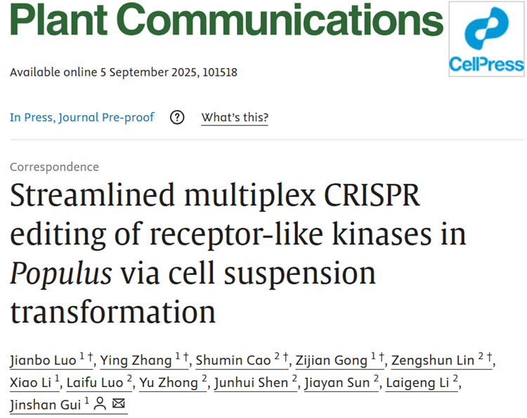 近日,Beat365中文官方网站桂金山教授团队在国际知名期刊《Plant Communications》上发表了题为“Streamlined multiplex CRISPR editing of receptor-like kinases inPopulusvia cell suspension transformation”(《通过细胞悬浮系转化实现杨树受体激酶的高效多重CRISPR编辑》)的研究论文。该研究成功建立了一种基于叶片直接诱导悬浮细胞的高效CRISPR基因编辑平台,突破杨树高通量多基因编辑的技术瓶颈,实现了受体激酶(RLKs)大规模突变体库的快速构建,为林木功能基因组学研究和分子育种提供强有力的技术支撑。