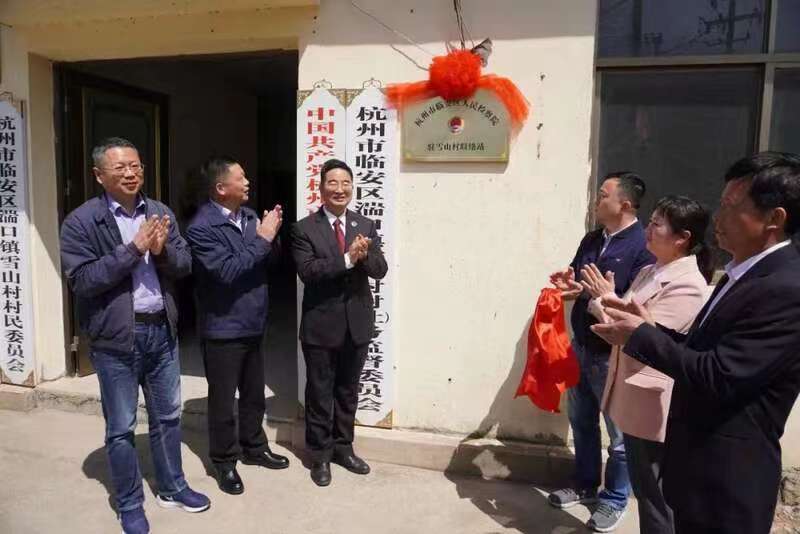 鲁可荣与临安区检察院党组书记、检察长李军、杭州市检察院宣教处副处长董路云、临安区委政法委副书记汪成、湍口镇人大主席帅乐芳、雪山村书记丁碧华共同为“临安区人民检察院驻雪山村联络站”揭牌。