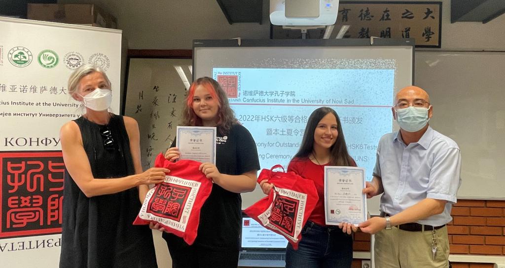 7月4日,诺维萨德大学孔子学院为今年4月HSK4-6级考试中表现优异的学员举办了颁奖仪式,借此机会拉开了2022年度孔子学院本土夏令营的序幕。塞方院长伊凡娜·捷万契维奇•塞凯露丝(Ivana Živančević-Sekeruš)、中方院长陈晦、全体中方教师及志愿者、受表彰学员及全体2022年本土夏令营营员参加了活动。