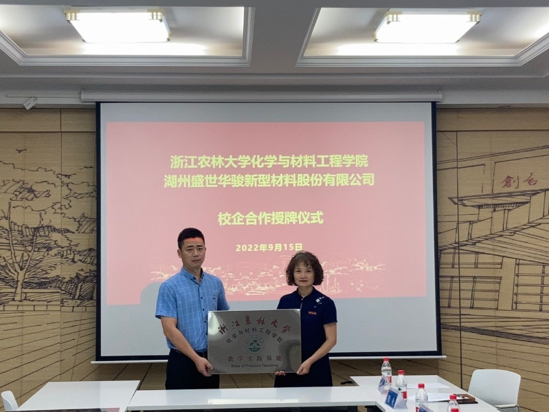 9月15日,化材学院负责人、高分子专业科技服务团队教师代表与湖州盛世华骏新材料股份有限公司负责人在国家木质工程中心举行了校企合作授牌仪式。