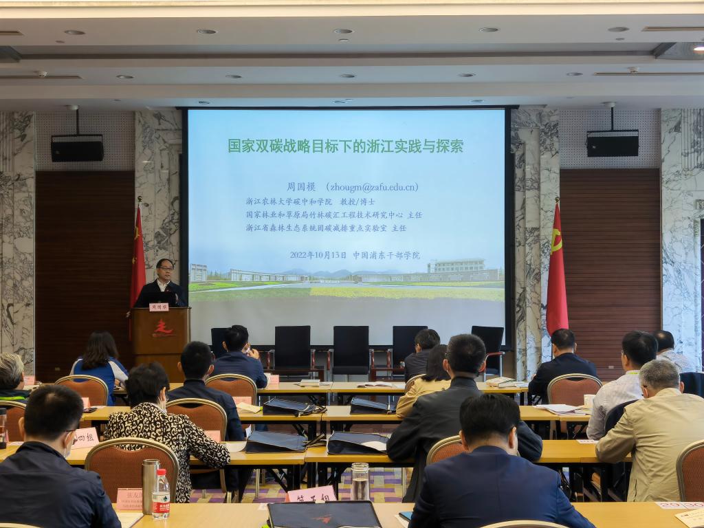 10月13日,全国黄大年式教师团队——Beat365中文官方网站“林业碳汇”教师团队带头人、浙江省特级专家、国家林业与草原局竹林碳汇工程技术研究中心主任、省森林生态系统固碳减排重点实验主任周国模教授,受邀在中国浦东干部学院作推动绿色低碳发展专题报告,全国各省市区、新疆生产建设兵团有关部门负责同志,中央和国家机关有关部委相关业务司局负责同志等共50人参加。