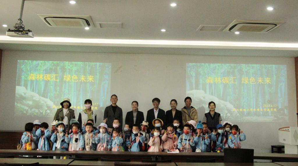 4月12日,环资院、碳中和学院为锦北街道中心幼儿园吴越人家园区小朋友开展了一场主题为“森林碳汇,绿色未来”的碳汇科普教育活动。活动邀请了学院森林碳汇团队的周宇峰教授、梅婷婷博士等专家,为小朋友们展示了《我是吸碳王》动画片,并赠送了周国模教授签名的《我是吸碳王》绘本。