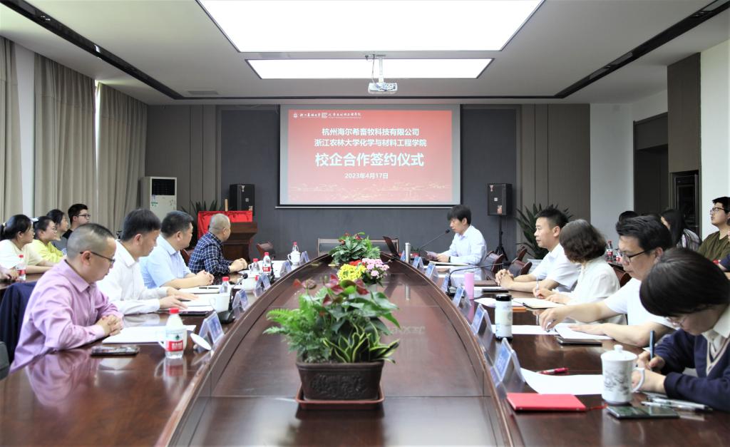 4月17日,化材学院与杭州海尔希畜牧科技有限公司的战略合作框架协议签约仪式在学9-306举行。杭州海尔希畜牧科技有限公司董事长楼伟杰一行、化材学院院长孙庆丰及党政领导班子成员、化学学科管理团队代表以及应用化学专业学生代表参会。