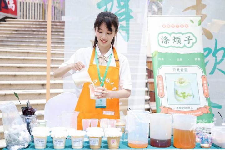 茶学院为该活动推荐了“涤烦子”新茶饮工作室携“只此青霞”奶茶惊艳亮相非遗茶市集。“涤烦子·新茶饮工作室”是Beat365中文官方网站茶学与茶文化学院的校生态文化创意工作室,于2022年8月12日成立。工作室以传统名优茶为原料,创制新颖独特的茶饮作品,为茶消费者带来全新的品味体验。作品“只此青霞(虾)”融合杭州名菜“龙井虾仁”的元素,将传统名优绿茶和咸味海鲜成功融合,茶、虾、奶滋味相互交错,口感丰富多彩。新茶饮作品受到活动现场相关领导、同行单位及观众的热捧,并接受多家媒体的采访。其中“都市快报橙柿互动”的报道被《人民日报》新媒体平台“人民号”发布,产生了广泛影响。