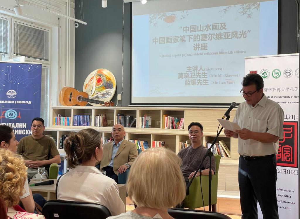 在诺维萨德市中心图书馆,两位画家简要介绍了中国山水画的艺术特色,现场进行了绘画创作,耐心回答了观众们对中国画的好奇和疑问,提供了宝贵的指导和解答。图书馆馆长亚力山大·马科维奇(Aleksandra Markanovic)向孔子学院中方院长陈晦表示,非常高兴中国知名画家不辞万里来到诺维萨德介绍中国传统绘画艺术,以现场呈现的方式让当地民众和广大读者近距离接触中国艺术和文化,这有助于大家进一步了解中国、增进两国传统友谊,更是助推塞尔维亚朋友更多了解中国及中国文化的良好契机。