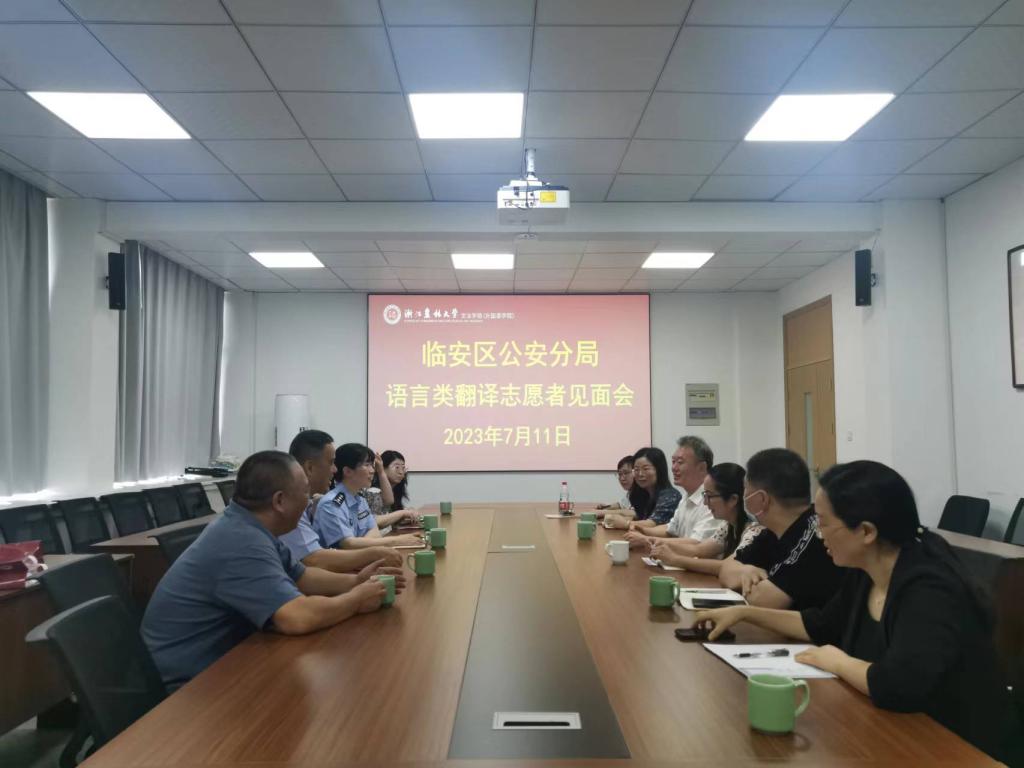 7月11日上午,临安区公安分局服务亚运语言翻译志愿者见面会在衣锦校区实验室612会议室召开。文法学院党委书记朱红东等相关领导,外语学科教师志愿者,保卫处,国教学院,临安区公安分局相关人员参加会议。会议由陈艳君主持。