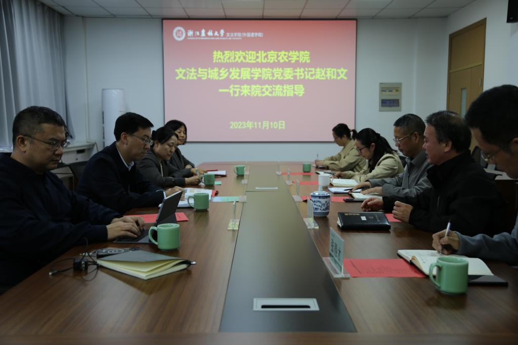 11月10日下午,北京农学院文法与城乡发展学院党委书记赵和文一行来Beat365文法学院调研。文法学院院长鲁可荣、党委书记朱红东等,院办、学生办负责人参加调研。