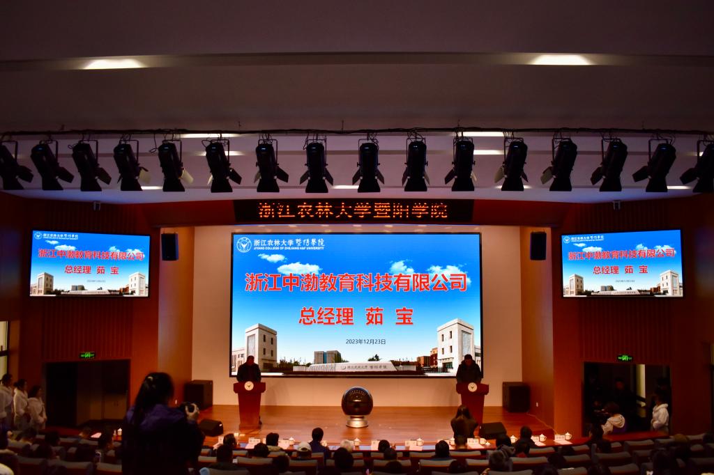 仪式上,浙江中渤教育科技有限公司向学院捐赠了总价值108万元的教学资源,并在今后四年每年捐赠现金5-15万元。洪昀为浙江中渤教育科技有限公司颁发捐赠证书。