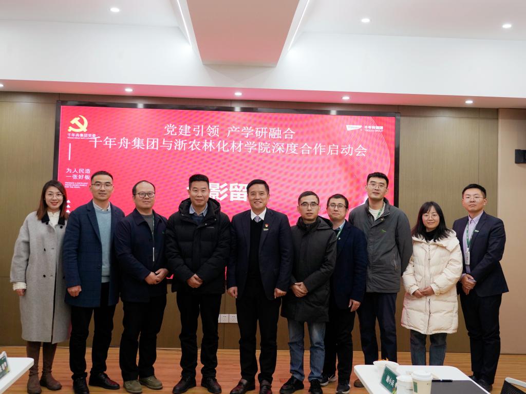 孙庆丰对千年舟集团长期以来支持学院办学表示感谢。随后,围绕支部建设、人才培养、品牌创建分享了学院党建工作概况和思路。他表示,长期以来,学院创新聘请以千年舟为代表的企业高管担任“企业家班主任”,以党建联建整合行业、龙头企业和校友资源,走深走实拔尖创新型人才培养。他希望,双方持续擦亮“党建+产学研”特色品牌,聚焦绿色低碳共富跑道,继续在人才培养、科学研究和社会服务等方面加强合作。