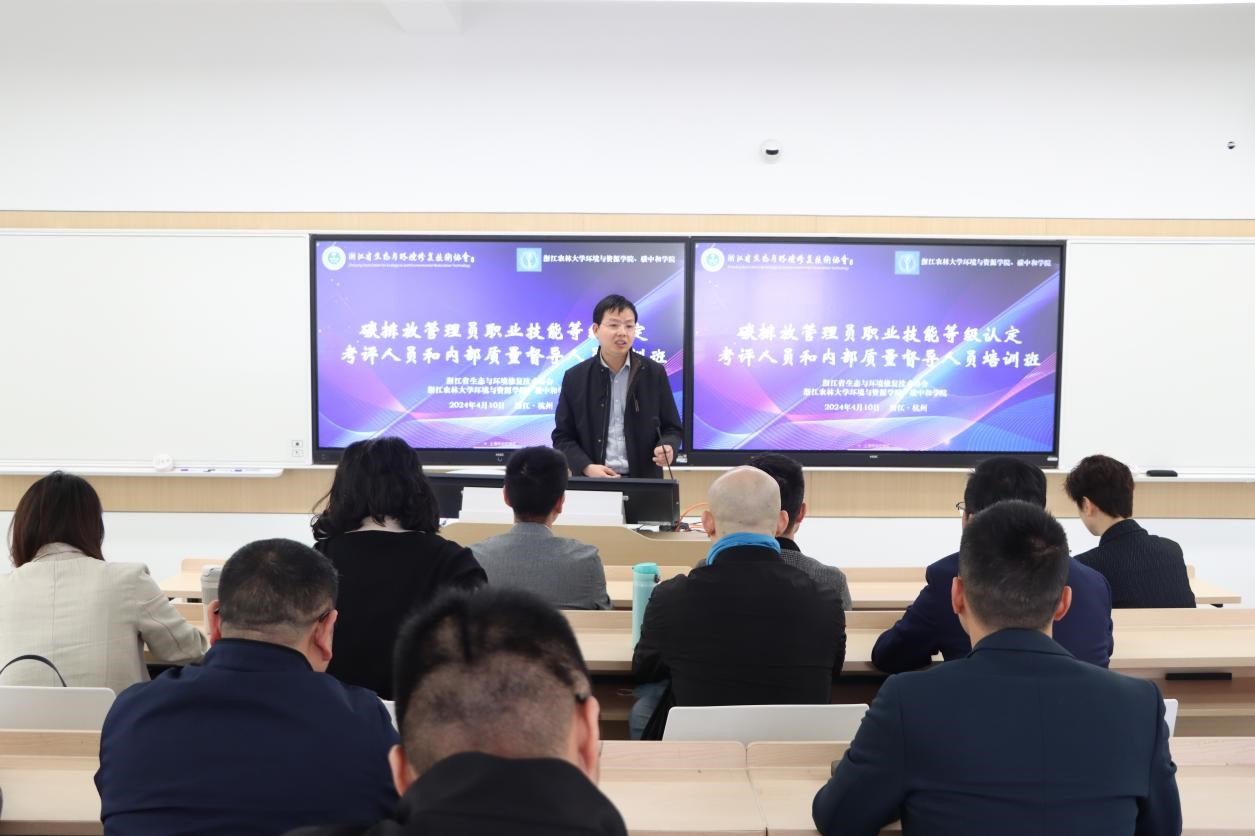 4月10日,由浙江省生态与环境修复技术协会主办,环资院、碳中和学院承办的碳排放管理员职业技能等级认定考评人员和内部质量督导人员培训班在Beat365中文官方网站东湖校区成功举办。环资院、碳中和学院张成、董达、周昕彦等教师参加培训。