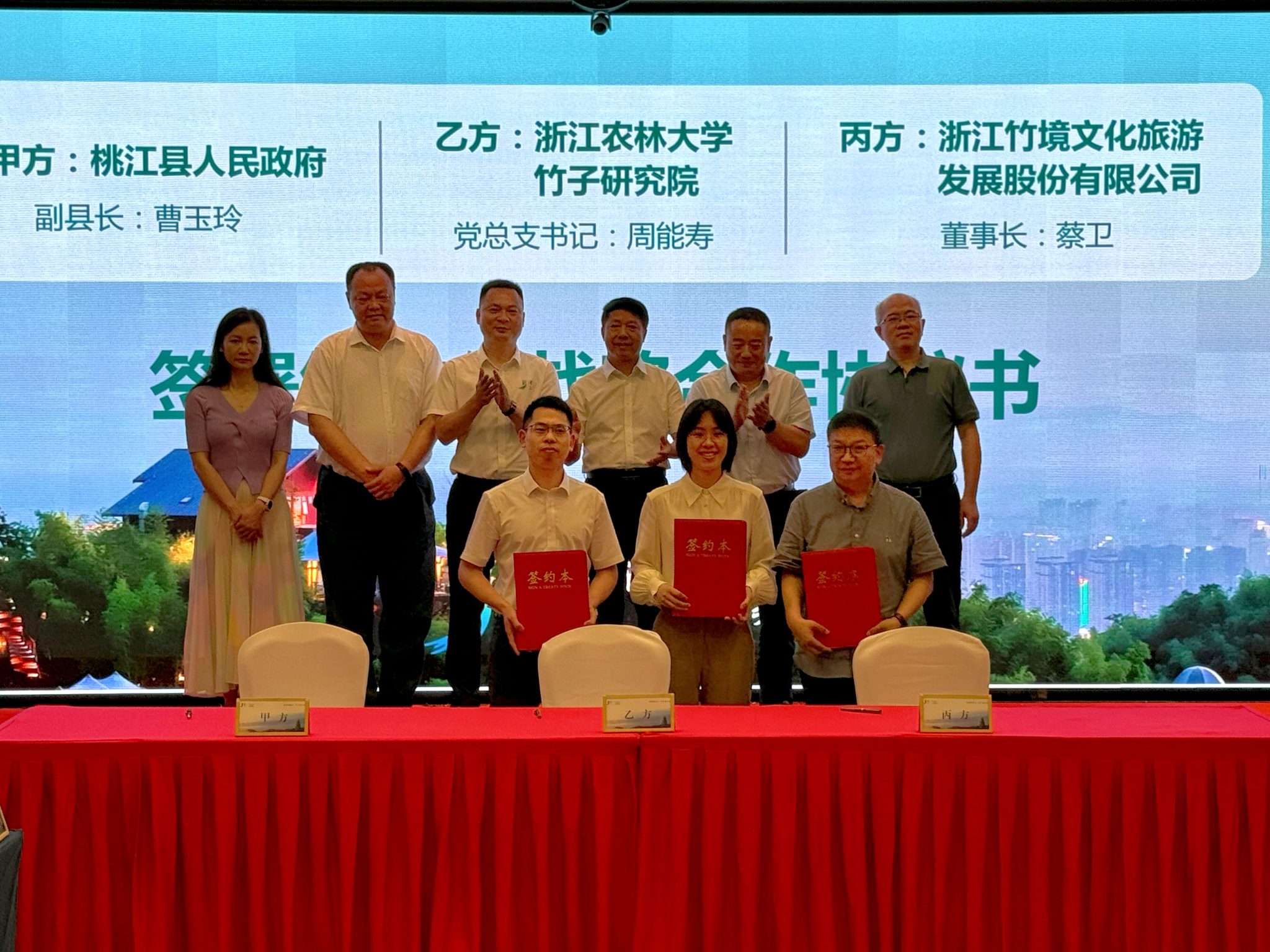 竹研院相关负责人与桃江县副县长曹玉玲代表双方签订了战略合作协议,竹研院党总支书记周能寿、桃江县副县长曹玉玲和浙江竹境文化旅游发展股份有限公司董事长蔡卫代表三方签订了竹文化战略合作协议,中竹商贸集团有限公司董事长黄学敏与桃江遇见美文化旅游投资有限公司总经理瞿建德代表双方签订了合作协议。