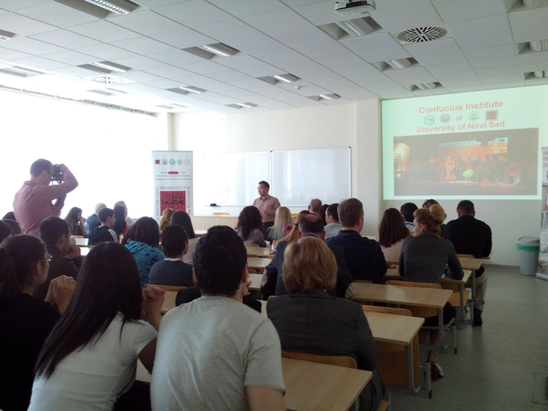 在Leskovac高等商业学校,赵有华受到了广大师生的热情接待。该校于2015年3月启动汉语教学,目前有30多位学生在学习汉语。Milena校长说:“中国是世界上最有影响力的经济强国之一,学习中文必将能为学生带来更多的工作机遇。”双方就在该校设立孔子学院下设课堂、开班商务汉语、旅游汉语项目及中外商务考察等进行了友好协商。会谈结束后,赵有华还向该校60多位师生进行了孔子学院专题讲座,详细介绍了孔院教学项目、文化活动、HSK考试及奖学金等内容,引起了学生们的极大兴趣。