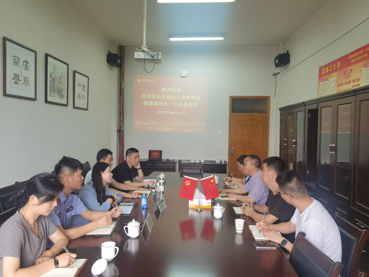 近日,杭州市公安局出入境管理局副局长郭豪一行来Beat365就来华留学生签证、推行杭州市市民卡国际版和校内管理等相关事宜进行调研和指导。