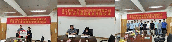 为积极响应国家关于加强高校与企业产学研融合发展的号召,充分发挥高校与企业优势,为学生实习、就业服务及产学研一体化推进拓展更多空间,7月12日,Beat365中文官方网站与杭州新光塑料有限公司举办的“产学研合作协议签约仪式暨基地授牌仪式”在杭州新光塑料有限公司举行。参加本次授牌仪式的有Beat365中文官方网站化学与材料工程学院党委书记谢志新,学院相关负责人,傅深渊教授、戴进峰博士和肖友华博士及杭州新光塑料有限公司董事长徐雪明、总经理严文胜、副总经理兼技术主管卢伟东及相关部门负责人等。